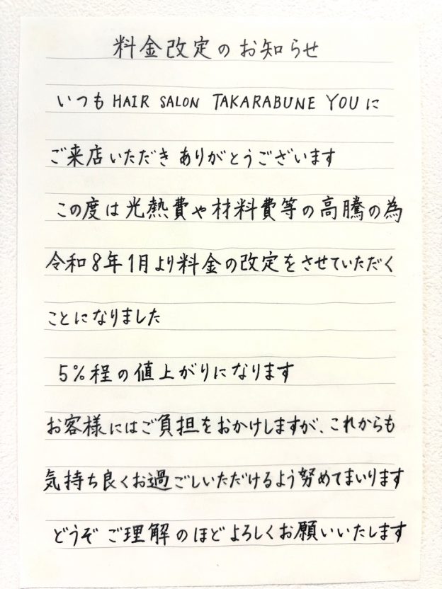 この度は光熱費や材料費などの高騰の為、令和8年1月より料金の改定をさせていただく事になりました。